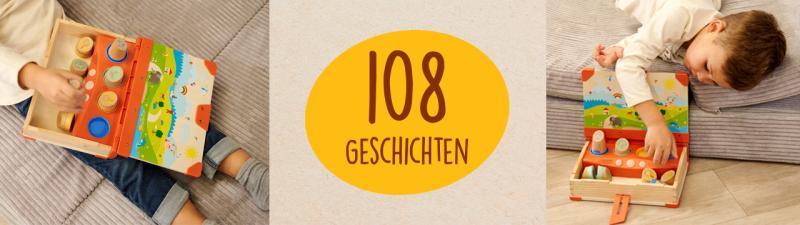 Das Besondere dabei ist, dass Kinder den Geschichten nicht nur passiv zuhören, sondern sie selbst aktiv spielerisch mitgestalten. Die Kinder wählen ihre eigene Geschichte indem sie 4 Holzfiguren auf den Stellflächen im Buch platzieren. Jede Kombination ergibt eine neue Geschichte.